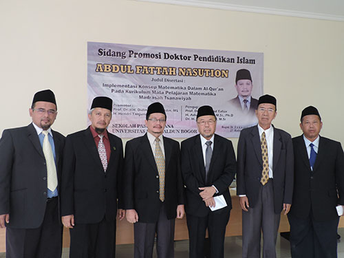 Kamis, 26 Januari 2017 sidang terbuka dalam promosi Doktor Pendidikan Islam dari Promovendus Abdul Fattah Nasution. Acara diadakan di ruang sidang gedung KH. Sholeh Iskandar Sekolah Pascasarjana Universitas Ibn Khaldun Bogor dengan judul Disertasi “Implementasi  Konsep Matematika Dalam Al-Qur’an Pada Kurikulum Mata Pelajaran Matematika Madrasah Tsanawiyah“.
