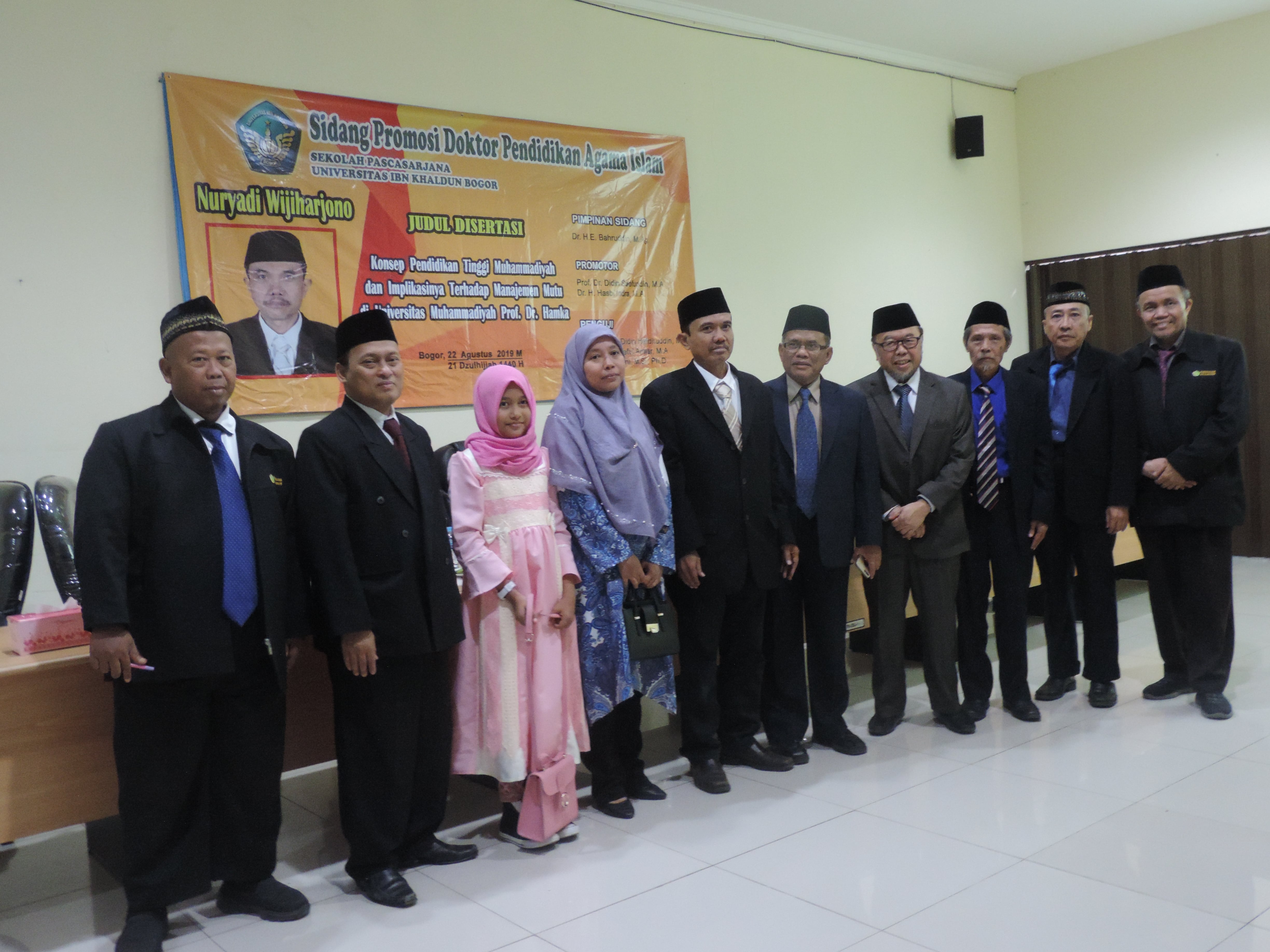 Bogor, 22 Agustus 2019 – Sidang terbuka dalam promosi Doktor Pendidikan Agama Islam dari Promovendus Nuryadi Wijiharjono. Acara diadakan di ruang sidang gedung KH. Sholeh Iskandar Sekolah Pascasarjana Universitas Ibn Khaldun Bogor dengan judul Disertasi “Konsep Pendidikan Tinggi Muhammadiyah dan Implikasinya Terhadap Manajemen Mutu di Universitas Muhammadiyah Prof. Dr. Hamka”.