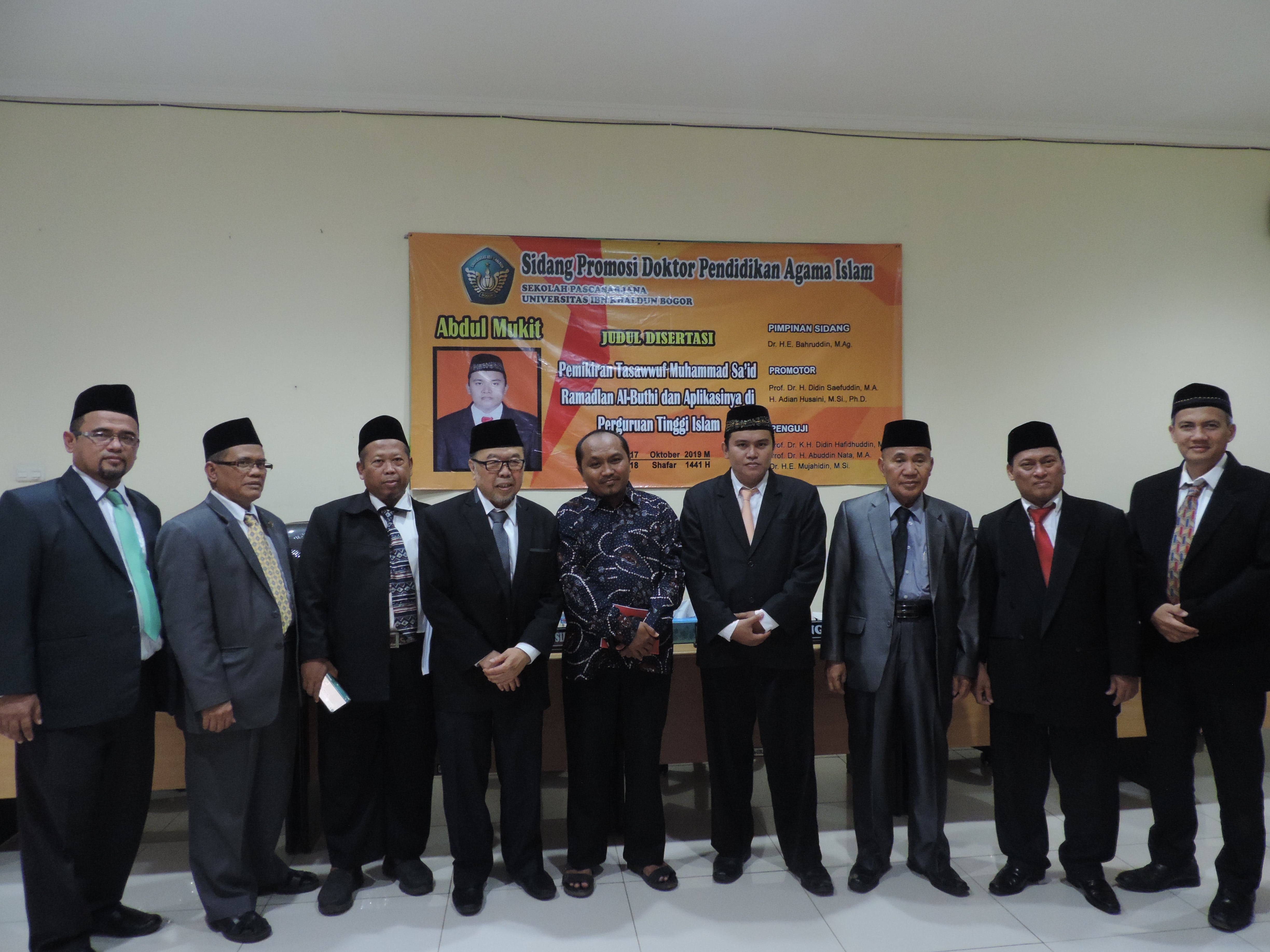 Bogor, 17 Oktober 2019 – Sidang terbuka dalam promosi Doktor Pendidikan Agama Islam dari Promovendus Abdul Mukit. Acara diadakan di ruang sidang gedung KH. Sholeh Iskandar Sekolah Pascasarjana Universitas Ibn Khaldun Bogor dengan judul Disertasi “Pemikiran Tasawwuf Muhammad Sa’id Ramadlan Al-Buthi dan Aplikasinya di Perguruan Tinggi Islam”.