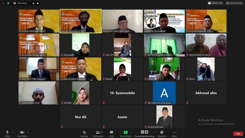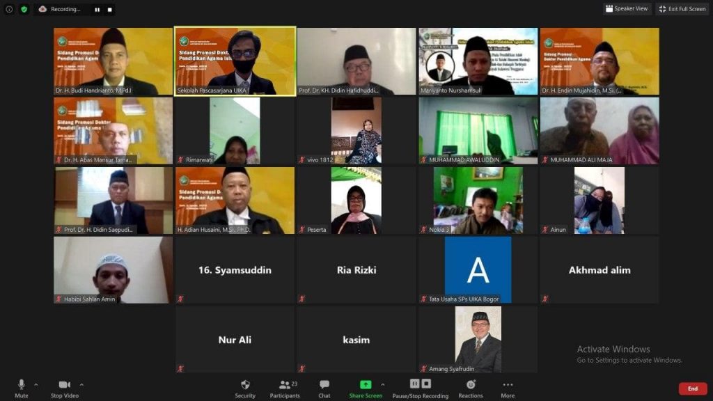 Bogor, 31 Agustus 2020 M/12 Muharam 1442 H– Sidang Terbuka Promosi Doktor Pendidikan Agama Islam dari Promovendus Mariyanto Nurshamsul. Pelaksanaan sidang diadakan secara daring (online) dengan judul Disertasi “Metode Talaqqi Pada Pendidikan Adab (Analisis Kitab ‘Uddatu At Talabi Binazmi Manhaji At Talaqqi Wa Al Adab dan Halaqah Tarbiyah di Wahdah Islamiyah Sulawesi Tenggara)”.