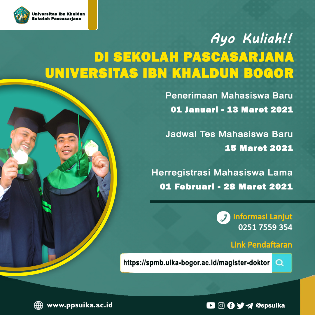 Ayo! Segera daftarkan diri anda di Sekolah Pascasarjana UIKA Bogor! Untuk akses Info lebih lanjut perihal Sekolah Pascasarjana UIKA Bogor silahkan hubungi kami di 0251-7559-354.