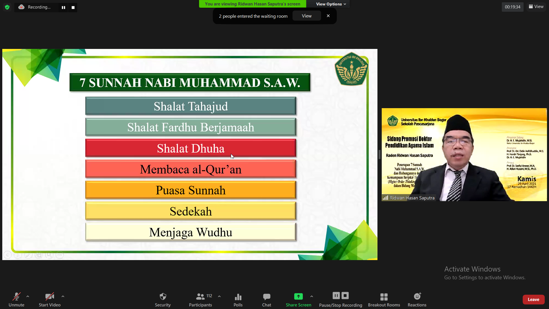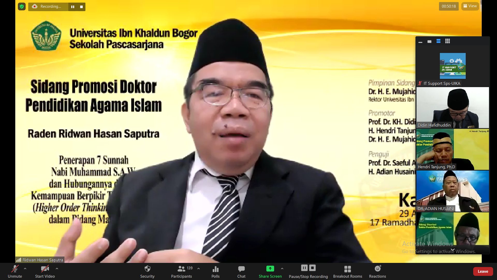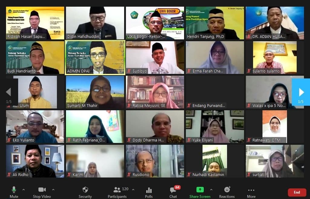 Sidang Terbuka Promosi Doktor Pendidikan Agama Islam dari Promovendus Raden Ridwan Hasan Saputra..Pelaksanaan sidang diadakan secara daring (online) dengan judul Disertasi “Penerapan 7 Sunnah Nabi Muhammad S.A.W. dan Hubungannya dengan Kemampuan Berpikir Tingkat Tinggi (Higher Order Thinking Skills) Siswa dalam Bidang Matematika”.