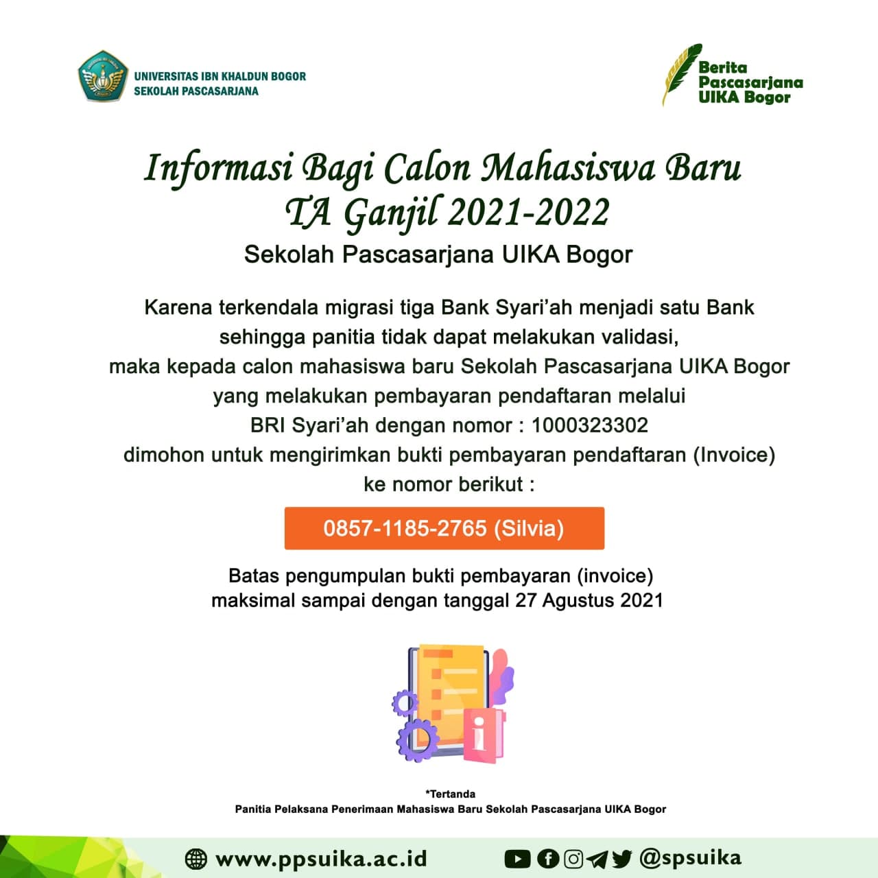 maka kepada calon mahasiswa baru Sekolah Pascasarjana UIKA Bogor yang melakukan pembayaran pendaftaran melalui BRI Syari’ah