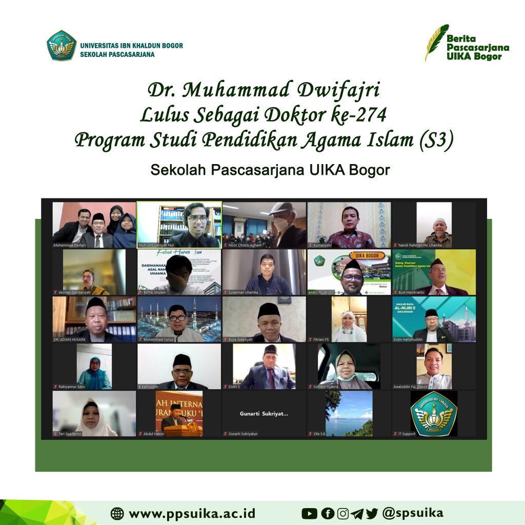 Telah dilaksanakan Sidang Terbuka Promosi Doktor Pendidikan Agama Islam dengan Promovendus Muhammad Dwifajri. Pelaksanaan sidang diadakan secara daring (online) dengan judul Disertasi :