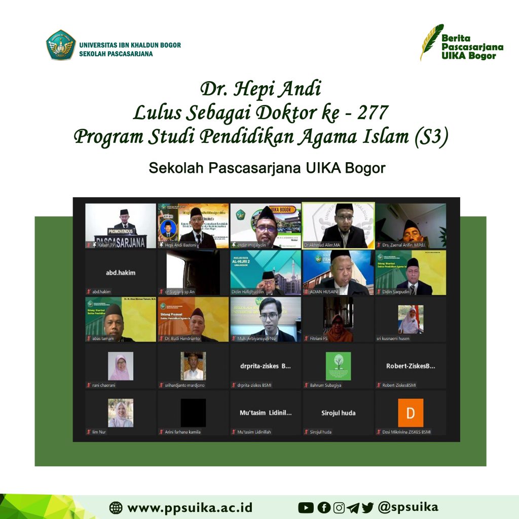 Gelar Doktor Pendidikan Agama Islam dianugerahkan oleh Sekolah Pascasarjana Universitas Ibn Khaldun Bogor kepada Dr. Hepi Andi sebagai Doktor ke – 277 .