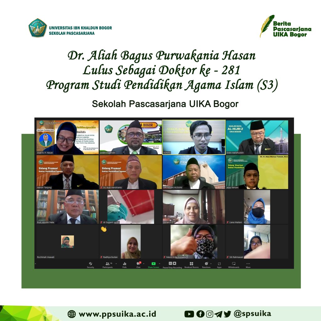 Pada Tanggal 30 Agustus 2022 M/ 2 Shafar 1444 H. Telah dilaksanakan Sidang Terbuka Promosi Doktor Pendidikan Agama Islam dari Promovendus Aliah Bagus Purwakania Hasan. Pelaksanaan sidang diadakan secara online di ruang sidang Sekolah Pascasarjana UIKA Bogor dengan judul Disertasi :