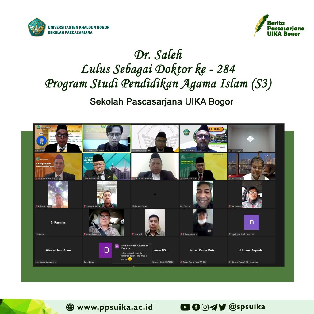 Gelar Doktor Pendidikan Agama Islam dianugerahkan oleh Sekolah Pascasarjana Universitas Ibn Khaldun Bogor kepada Dr. SALEH sebagai Doktor ke – 284 .
