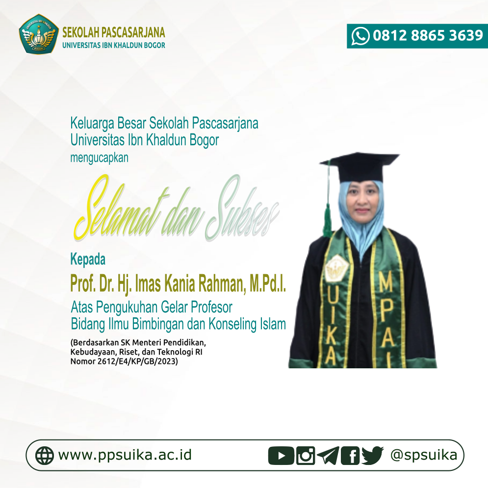 Segenap Keluarga Besar Sekolah Pascasarjana Universitas Ibn Khaldun (UIKA) Bogor mengucapkan Selamat dan Sukses kepada Prof. Dr. Hj. Imas Kania…