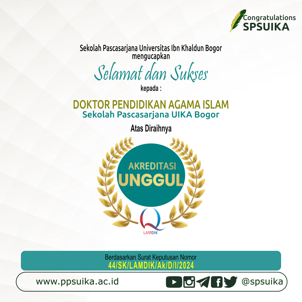 Program Studi Doktoral Pendidikan Agama Islam (DPAI) berhasil meraih akreditasi Unggul dengan skor sebesar 375. Skor ini jauh di atas standar minimal nilai akreditasi Unggul yaitu sebesar 361. Hasil akreditasi Unggul tersebut dikeluarkan oleh Lembaga Akreditasi Mandiri Kependidikan (LAM DIK), berdasarkan Keputusan No.44/SK/LAMDIK/Ak/D/1/2024, pada tanggal 04 Januari 2024 yang lalu. Dengan demikian, dari 34 Prodi S3 Doktor Pendidikan Agama Islam se-Indonesia, yang berpredikat sekarang menjadi UNGGUL hanya 4, salah satunya adalah Prodi DPAI UIKA Bogor.