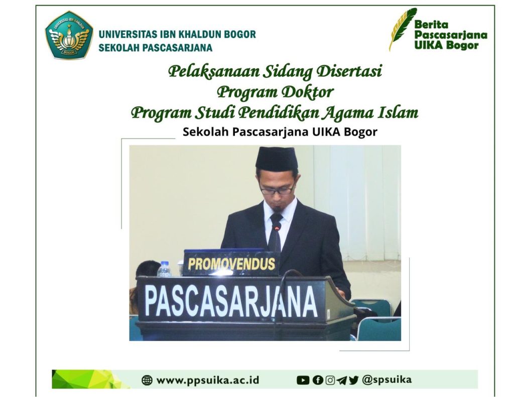 Bogor, 07 Maret 2024. Sidang terbuka Promosi Doctor Pendidikan Agama Islam Sekolah Pascasarjana UIKA Bogor yaitu Sdr. Ade Juang Eko Prasetyo berjudul “Uslub Tasybih di dalam Surah Al – Baqarah dan Ali Imran dan Dalalahnya terhadap metode Pendidikan Islam” bertempat di ruang Serbaguna, Pascasarjana Universitas Ibn Khaldun Bogor.