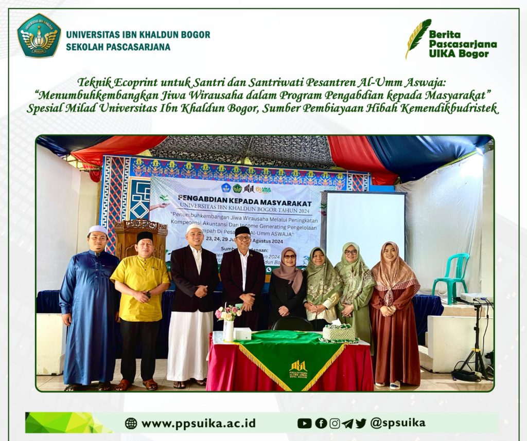 Bogor, 23 Juli 2024 —Dalam rangka memperingati Milad Universitas Ibn Khaldun (UIKA) Bogor yang ke-63, dan sebagai bagian dari Program Pengabdian Kepada Masyarakat. UIKA Bogor bekerjasama dengan Pesantren Al-Umm Aswaja dalam melaksanakan pelatihan Teknik Ecoprint bagi santri dan santriwati. Kegiatan ini diselenggarakan dengan dukungan sumber pembiayaan dari hibah Kemendikbudristek.