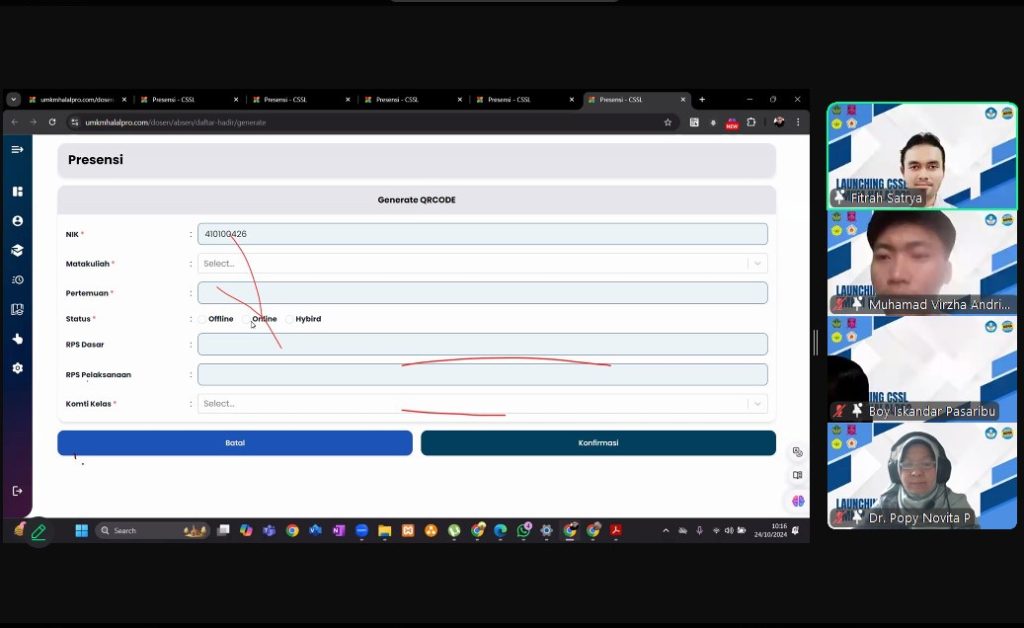 Bogor, 24 Oktober 2024 – Launching CSSL UMKM HalalPro telah sukses diselenggarakan secara daring, dihadiri oleh 270 mahasiswa, dosen, serta alumni. Kegiatan ini merupakan hibah riset dari DRPTM Kemendikbud Ristek dengan skema penelitian kolaborasi strategis untuk Universitas Ibn Khaldun Bogor, Institut Bisnis dan Informatika Kesatuan Bogor, Universitas Pakuan, dan Universitas Nusa Putra. Acara ini menjadi langkah awal dalam meningkatkan kompetensi melalui literasi digital dan manajemen proyek agar mampu bersaing di kancah global.
