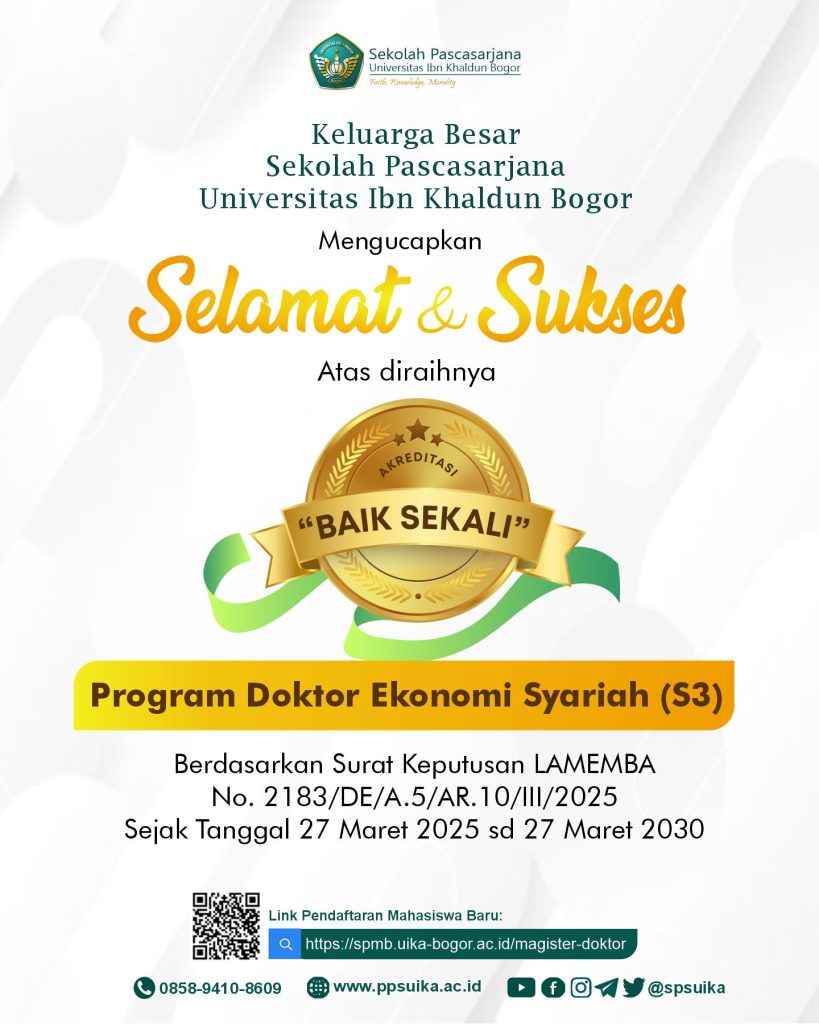 Segenap keluarga besar Sekolah Pascasarjana Universitas Ibn Khaldun Bogor mengucapkan selamat dan sukses kepada Program Doktor Ekonomi Syariah atas diraihnya predikat Baik Sekali berdasarkan Surat Keputusan LAMEMBA No. 2183/DE/A.5/AR.10/III/2025 sejak tanggal 27 Maret 2025 hingga 27 Maret 2030.