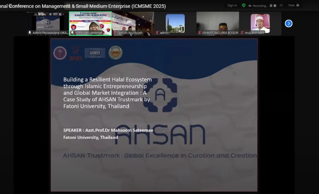 Dari Thailand, Asst. Prof. Dr. Mahsoom Sateemae memaparkan studi kasus AHSAN Trustmark, inisiatif Fatoni University untuk meningkatkan daya saing produk halal, khususnya industri hijab di Thailand Selatan. Program ini fokus pada pelatihan keterampilan, sertifikasi halal, branding, dan integrasi pasar global. Produk-produk bersertifikat AHSAN telah berhasil diekspor keSaudi Arabia, Malaysia, dan India, serta mengikuti pameran halal internasional. “AHSAN Trustmark is a resilient model of the halal ecosystem that combines Islamic values with modern business practices,” ujarnya.