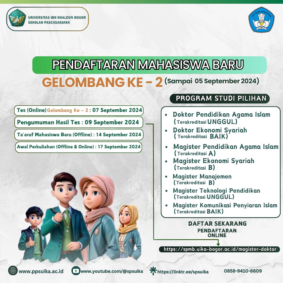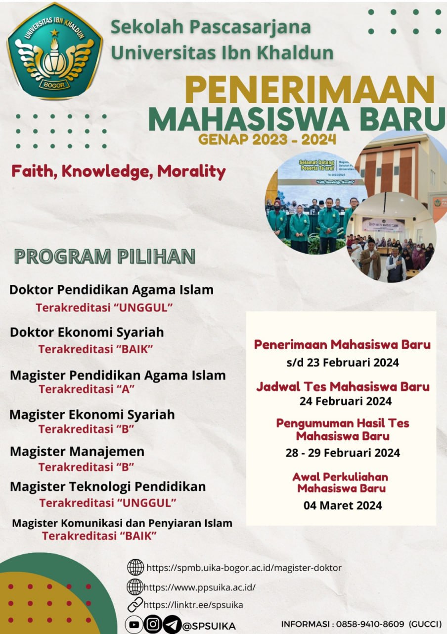 Assalamu’alaikum warahmatullahi wabarakatuh#Sobat SPS UIKA BogorInformasi Penerimaan Mahasiswa Baru (PMB) Sekolah Pascasarjana Universitas Ibn Khaldun Bogor T.A Genap 2023/2024 Program…